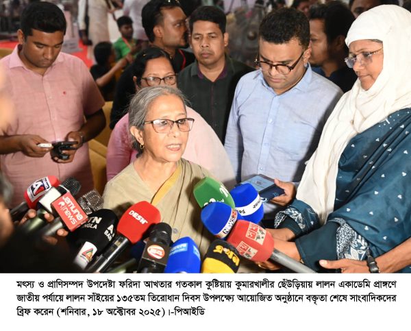 কুমারখালী (কুষ্টিয়া) প্রতিনিধি : মৎস্য ও প্রাণিসম্পদ উপদেষ্টা ফরিদা আখতার বলেছেন, “লালন সাঁইজ্বী যে অন্যায়-অবিচারের বিরুদ্ধে মন ঠিক রাখতে বলেছেন, তা যেন আমরা নিজেদের জীবনে ধারণ করতে পারি—এই চেষ্টাই আমাদের হওয়া উচিত। যদি আমরা আমাদের মনকে সৎ পথে রাখতে পারতাম, তাহলে সমাজে এত অন্যায়-অবিচার ঘটতো না।”