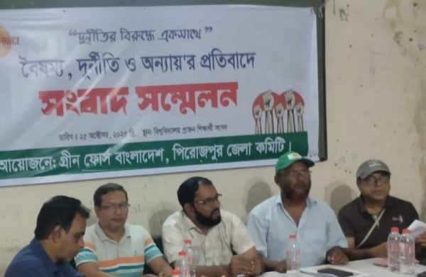 পিরোজপুর জেলা প্রতিনিধীঃ গ্রীন ফোর্স বাংলাদেশ, পিরোজপুর জেলার উদ্যোগে “বৈষম্য, দুর্নীতি ও অন্যায়”র প্রতিবাদে বিশ্ববিদ্যালয় ক্লাবে সংবাদ সম্মেলন অনুষ্ঠিত হয়। সংগঠনটির জেলা সভাপতি মইনুল আহসান মুন্না লিখিত বক্তব্য উপস্থাপন করেন। এ সময়ে উপস্থিত ছিলেন-সর্ব সাধারন সম্পাদক মো: নাসির উদ্দিন, সহ সভাপতি আফজাল হুসাইন লাভলু, মো: শাহদাত হোসেন, যুগ্ন সম্পাদক মো: নুরউদ্দিন, তানিয়া রহমান, অর্থ সম্পাদক আব্দুল আলীম খান, প্রচার সম্পাদক হাছিবুর রহমান , দপ্তর সম্পাদক অদিতি মন্ডল, জেলা কমিটির সদস্য এম, আবুল হোসেন দুলাল প্রমুখ।