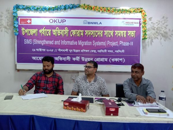 নরসিংদী প্রতিনিধিঃ নরসিংদীতে উপজেলা পর্যায়ে অভিবাসী ফোরাম সদস্যদের সাথে সমন্বয় সভা অনুষ্ঠিত।বুধবার (২৯ অক্টোবর)সকালে শীলমান্দী যুব উন্নয়ন প্রশিক্ষণ কেন্দ্রের হল রুমে অভিবাসী কর্মী উন্নয়ন প্রোগ্রাম(ওকাপ)এর আয়োজনে নরসিংদী সদর উপজেলা পর্যায়ে অভিবাসী ফোরাম সদস্যদের সাথে সমন্বয় সভা অনুষ্ঠিত হয়েছে।মানব পাচার প্রতিরোধের লক্ষ্যে, মানব পাচার থেকে উদ্ধারপ্রাপ্ত নারী ও পুরুষদের জন্য সহযোগিতা, মানবপাচার সমাজে কি ধরনের প্রভাব ফেলে, একটি পরিবার কিভাবে মানবপাচারের স্বীকার হয়,স্থানীয় দালালের খপ্পরে পড়ে কিভাবে নিজেকে দক্ষ না করেই একজন মানুষ বিদেশে পাড়ি জমায় এবং পরবর্তীতে কিভাবে প্রতারণার স্বীকার হয় এসব বিষয় তুলে ধরা হয় আলোচনায়। বিদেশগামীদের মনস্তাত্ত্বিক নানাবিধ বিষয়,অভিবাসী আইন এবং মানব পাচার রোধে নানাবিধ পরিকল্পনা আলোচনা করা হয় এই সভায়।সভায় কমিটির সদস্যদের সাথে মানব পাচার সচেতনতা তৈরিতে নিরাপদ অভিবাসন,বাংলাদেশের শ্রম-অভিবাসন ও মানব পাচার এবং নরসিংদী জেলায় মানব পাচারের প্রেক্ষাপট তুলে ধরা হয়।মানব পাচার প্রতিরোধে কমিটির ভুমিকা এবং কর্ম-পরিধি নিয়ে আলোচনা করা হয়।এসময় উপস্থিত ছিলেন,ওকাপ নরসিংদী জেলা ব্যবস্থপক মোঃ ওসমান গনি,ওকাপ নরসিংদী প্রজেক্ট অফিসার মোঃবাবুল হোসেন,ওকাপ ঢাকা এডভোকেসি অফিসার নিথরা মেহরাব,ওকাপ ঢাকা প্রোগ্রম কো-অডিনেটর এ এ মামুন ( নাসিম) প্রমুখ।