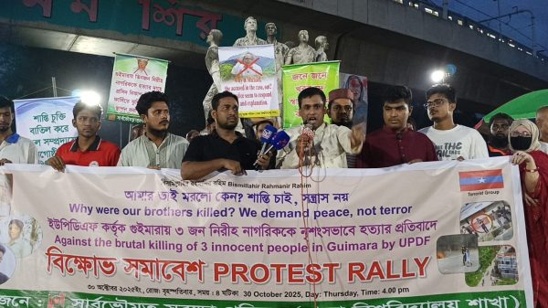 বক্তারা বলেন,”আজ পাহাড়ে যারা নিরীহ মানুষ হত্যা করছে, তারাই শান্তির মুখোশ পরে আন্তর্জাতিক মহলে মিথ্যাচার চালাচ্ছে। এই সন্ত্রাসীদের বিচারের আওতায় আনতে হবে-নইলে পাহাড়ে স্থায়ী শান্তি প্রতিষ্ঠা অসম্ভব।”